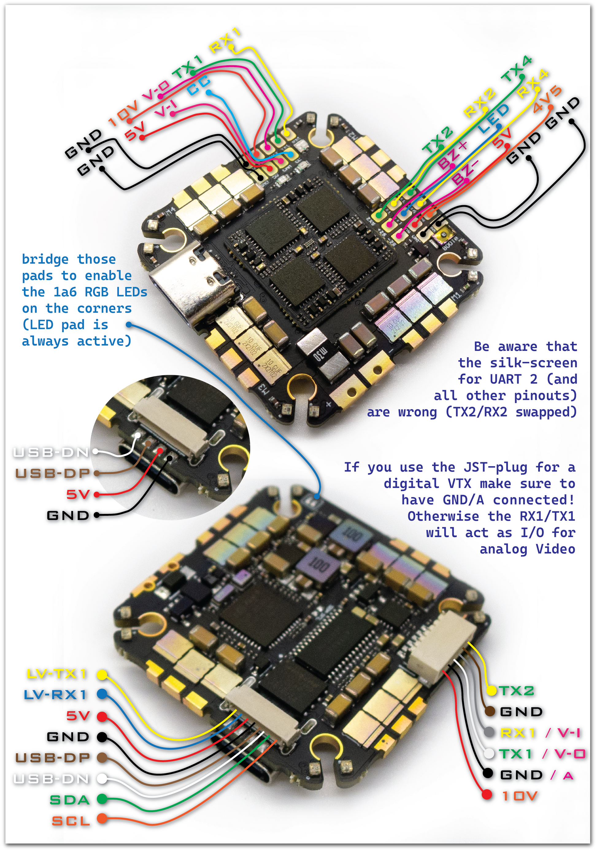Airbot did a great job putting a STM32G47X MCU, an ICM 42688p, 16MB flash, four AM32 ESCs and even an DSP310 barometer on that small footprint. They even managed to put 16 RGB-LEds on the corners (just be carefull when installing the gummies).